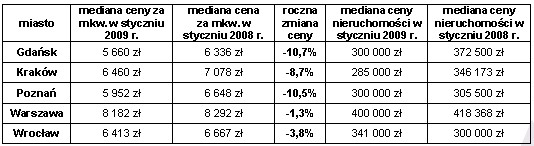 W porównaniu do stycznia ubiegłego roku ponad 10-proc. spadki cen zanotowano w Gdańsku i Poznaniu, a w Krakowie spadek cen zbliżył się do 9 proc. W stolicy ceny ustabilizowały się nieznacznie tylko poniżej ubiegłorocznej mediany.