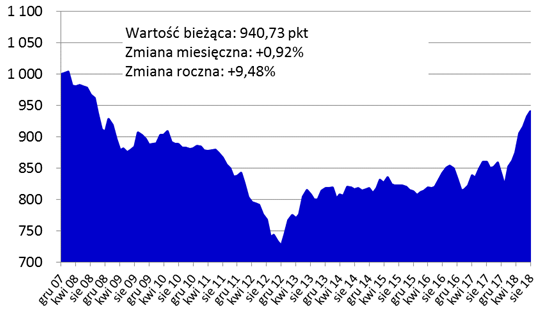Siódmy miesiąc z rzędu notowanie Indeksu Cen Transakcyjnych jest wyższe od poprzedniego. W niektórych miastach tylko w roku kalendarzowym 2018 ceny mieszkań wzrosły o kilkanaście procent. Aktualne notowanie IDK wynosi 940,73 pkt i jest o 9,5 proc. wyższe niż rok temu. Aktualna wartość Indeksu jest najwyższa od września 2018 r., co oznacza, że mieszkania w największych miastach Polski są obecnie najdroższe od 10 lat. IDK jest wskaźnikiem wyliczanym na podstawie transakcji mieszkaniowych dokonanych przez klientów Home Brokera i Open Finance obrazuje więc realne stawki, jakie płacone są za lokale mieszkalne w największych miastach Polski.