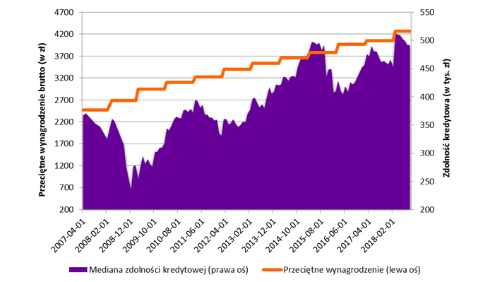 Mediana zdolności kredytowej 3-os. rodziny z dochodem na poziomie dwóch średnich krajowych (wysokość kredytu w PLN)