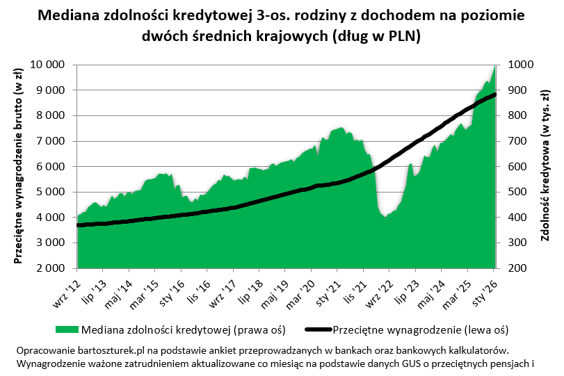 Trochę ponad milion złotych – taka jest obecnie przeciętna zdolność kredytowa trzyosobowej rodziny z dochodem na poziomie dwóch średnich krajowych – wynika z najnowszych deklaracji banków. To najwyższy wynik w historii. Kwota ta jest dziś o 1/3 wyższa niż w analogicznym okresie przed rokiem.