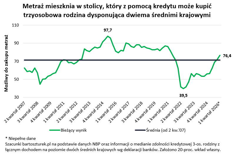 Wstępne dane sugerują, że dziś przykładowa rodzina dysponująca sporym wkładem własnym i dochodem na poziomie dwóch średnich krajowych mogłaby kupić mieszkanie o powierzchni ponad 76 metrów kwadratowych. To o 20 metrów więcej niż rok temu. Mówimy więc o dodatkowym salonie lub nawet dwóch skromnych pokojach.