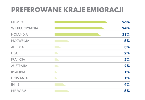 z korzystniejszymi warunkami do życia i pracy. Wśród nich znalazły się miedzy innymi wyższy standard życia (33%), możliwość podróżowania i zwiedzania świata (23%), lepsza służba zdrowia (22%) czy lepsze warunki socjalne(18%). Istotnym czynnikiem motywującym do wyjazdu dla Polaków jest również środowisko zawodowe. Aż 26% badanych wskazało szersze perspektywy rozwoju kariery jako powód motywujący do wyjazdu z Polski, 23% uznało za motywujący brak odpowiedniej pracy w Polsce, a 14% wskazało na wyższy poziom kultury zawodowej.