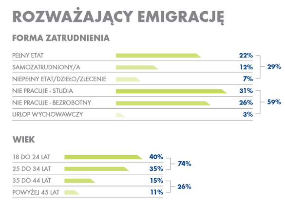 Osoby deklarujące chęć wyjazdu to nie tylko bezrobotni, czy zniechęceni długotrwałym szukaniem pracy. Z raportu wynika, że bezrobotni stanowią 26% rozważających wyjazd, podczas gdy pracujący to aż 41% tej grupy. Co ciekawe, prawie dwukrotnie więcej osób zatrudnionych na pełen etat deklarowało chęć wyjazdu (22%) w porównaniu do pracujących na zasadach umowy o dzieło, zlecenie, czy w niepełnym wymiarze godzin (12%). Najliczniejszą grupą pod względem statusu, deklarującą chęć wyjazdu, są osoby uczące się. Stanowią oni aż 31% rozważający wyjazd zarobkowy w ciągu najbliższego roku.