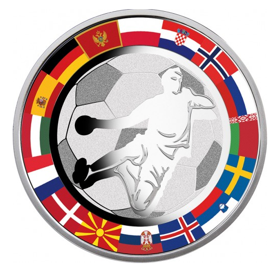 Moneta przedstawia szczypiornistę na tle stylizowanej powierzchni dekoracyjnej imitującej piłkę ręczną, w otoczeniu wielobarwnych flag 16 państw walczących o tytuł Mistrza Europy 2016.