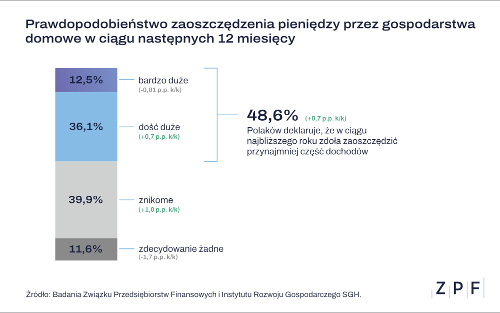 Jednocześnie maleje udział gospodarstw domowych najbardziej pesymistycznie oceniających swoje możliwości. Odsetek respondentów deklarujących, że szanse na oszczędzanie są „zdecydowanie żadne”, spadł do 11,6 proc., choć nadal znacząca pozostaje grupa osób oceniających swoje możliwości jako „znikome” (39,9 proc.).