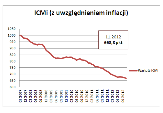 Dalszy spadek zanotował także Indeks Cen Mieszkań uwzględniający inflację (ICMi). W listopadzie jego wartość była niższa niż w październiku o 2,9 pkt. i wyniosła 668,8 pkt. W porównaniu z listopadem ub. roku spadek wartości ICMi wyniósł 58,8 pkt.. Oznacza to, że realnie spadek cen mieszkań na rynku wtórnym w ciągu ostatnich 12 miesięcy wyniósł 8%.