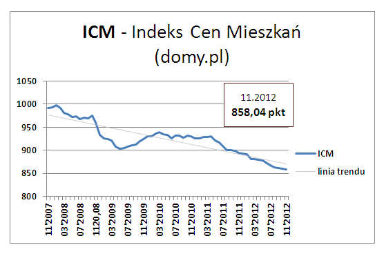 Skutkiem takiego stanu rzeczy jest dalszy spadek cen, który wyraża spadek wartości Indeksu Cen Mieszkań (ICM) portalu domy.pl. W listopadzie jego wartość spadła o ponad 2,4 pkt. do poziomu 858,04 pkt., co oznacza, że w skali ostatnich 12 miesięcy spadek wartości ICM sięgnął 36,9 pkt., tj. 4,1%.
