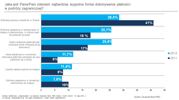 Co prawda w dalszym ciągu największy odsetek Polaków przed zagraniczną podróżą udałby się do kantoru po walutę, jednak liczba takich osób w ciągu ostatnich dwóch lat znacząco spadła. W badaniu Deutsche Bank PBC przeprowadzonym przez Instytut Homo Homini w czerwcu 2011 r., aż 41 proc. respondentów wskazywało, że najbardziej wygodną formą dokonywania płatności za granicą jest korzystanie z uprzednio kupionej w polskim kantorze gotówki. W tegorocznym badaniu taką odpowiedź wybrało już tylko 28,5 proc. ankietowanych.
