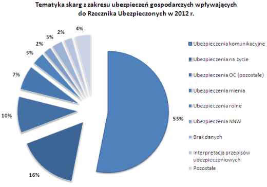 Z opublikowanego w marcu sprawozdania Rzecznika Ubezpieczonych za 2012 rok wynika, że w ubiegłym roku Polacy złożyli 15.273 pisemnych skarg z zakresu problematyki ubezpieczeń gospodarczych. Było to o 6,4% skarg więcej niż rok wcześniej. Najliczniejsza grupa skarg odnosiła się do ubezpieczeń komunikacyjnych (53,1%). Kolejne w zestawieniu były skargi na ubezpieczenia na życie (16,1%), pozostałe ubezpieczenia OC (9,7%) i ubezpieczenia mienia (6,5%). Pozostałe skargi dotyczyły zarówno polis, jak i procedur stosowanych przez zakłady ubezpieczeń.