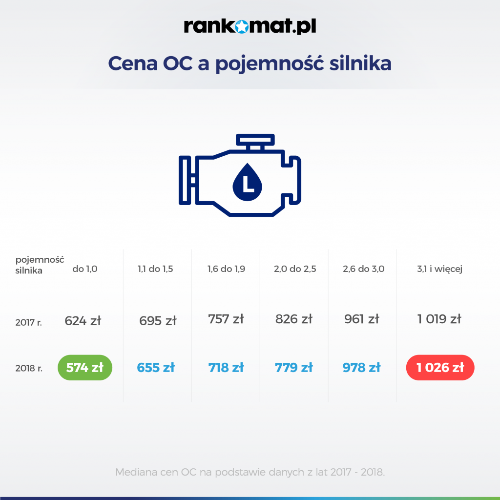 W 2018 roku najwięcej na obowiązkowe ubezpieczenie wydawali właściciele samochodów z największą pojemnością silnika. W przypadku aut z silnikiem powyżej 3,0 l, koszt polisy OC był wyższy o 78,7% niż dla samochodów z silnikiem do 1,0 l.