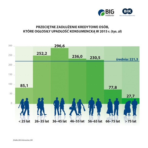 Przeciętne zadłużenie osób, które mają jeden kredyt lub więcej, wyniosło na koniec 2015 r. 221,3 tys. zł i w porównaniu z pierwszą połową roku wzrosło o 60 tys. zł. Średnio na osobę nieco większą kwotę winni są bankom mężczyźni niż kobiety, odpowiednio jest to 222,1 tys. zł i 220,7 tys. zł, co także jest pewną odmianą wobec wcześniejszych danych. Najchętniej z upadłości korzystają 36-45 latkowie i jednocześnie ta grupa wiekowa ma najwyższe zadłużenie.