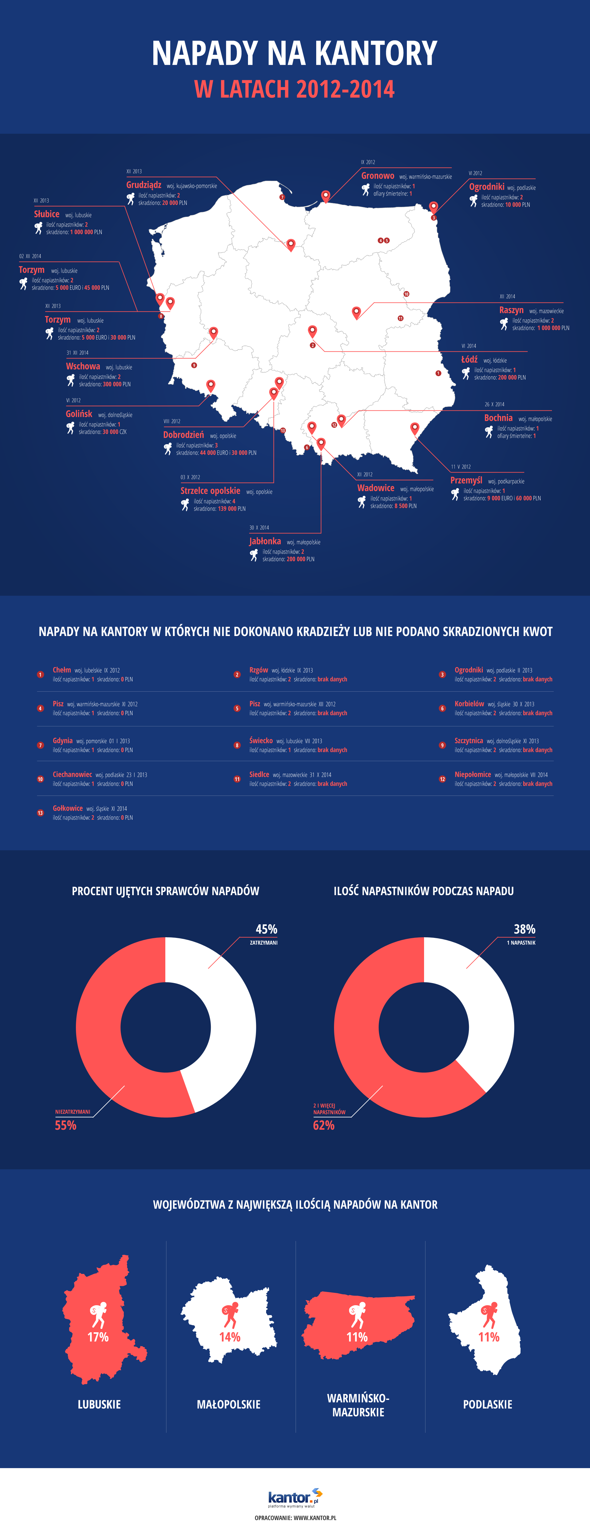 Co roku co najmniej w kilku miejscach w kraju mają miejsce napady na kantory. Często w wyniku napadu na kantor cierpią pracownicy, równie często sprawcy nie są schwytani przez Policję. Na przestrzeni ostatnich dwóch lat doszło do napadów zarówno z bronią w ręku, ofiarami śmiertelnymi, jak też udaremnionych i nieudanych napadów.