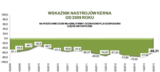Z przeprowadzonego badania Keralla Research wynika, że wskaźnik nastrojów przedsiębiorstw KERNA wzrósł do poziomu minus 58,31 pkt. i jest o wyższy o 19,38 pkt. w stosunku do ubiegłego kwartału. Co ważne, porównując do analogicznego okresu roku 2012 jest on niższy tylko o 1,07 pkt. Tak więc mimo wciąż słabych danych dotyczących gospodarki pesymistyczne nastroje nie pogłębiają się, a trend negatywny został – przynajmniej czasowo – zahamowany.