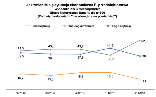 Ponad połowa badanych uważa, że sytuacja ekonomiczna przedsiębiorstwa nie zmieniła się ani na lepsze ani na gorsze w ostatnim czasie (52,8 proc.).