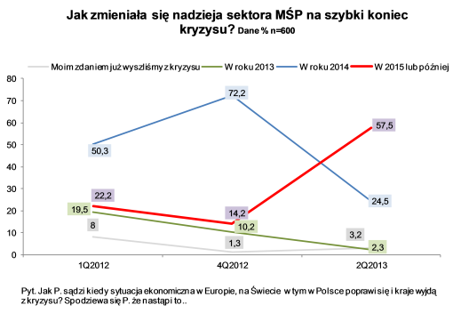 Kiedy postawiliśmy pytanie o koniec kryzysu po raz pierwszy w 2009 roku usłyszeliśmy, że kryzysu w Polsce nie ma. Konsumpcja była wówczas na relatywnie wysokim poziomie, bezrobocie też nie rosło tak jak obecnie, a największe inwestycje drogowe i infrastrukturalne były przed nami. Przedsiębiorcy MŚP, także początkowo sądzili, że kryzys to drobny epizod. W 2009 roku zapytaliśmy firmy kiedy sytuacja ekonomiczna w Europie, na świecie w tym w Polsce poprawi się i kraje wyjdą z kryzysu – wówczas niemal 60 proc. ankietowanych mówiła, że nastąpi to w drugiej połowie 2010, najpóźniej w 2011.