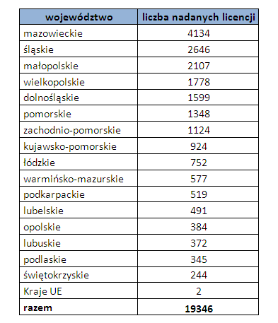 Pod względem liczby licencjonowanych pośredników prym wiedzie woj. mazowieckie; jest w nim zarejestrowanych przeszło 1/5 wszystkich pośredników (4134). Kolejne miejsca wg liczebności zajmują woj. śląskie (2646) i woj. małopolskie (2017).