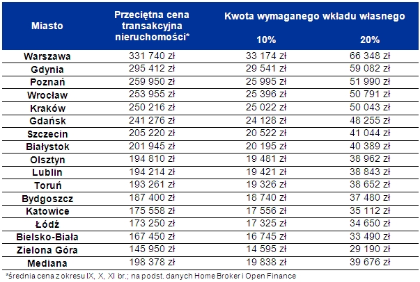 Spośród 16 miast ujętych w zestawieniu, największe kwoty będą potrzebne w Warszawie. W 2014 r. wkład własny na poziomie 10% będzie oznaczał konieczność zgromadzenia ponad 33 tys. złotych. Rok później będzie już potrzebna kwotą ponad 66 tysięcy. Kwotę ponad 50 tysięcy złotych będą też musiały zgromadzić osoby, które za nieco ponad dwa lata planują zakup mieszkania w Gdyni, Poznaniu, Wrocławie i Krakowie. Tylko w Zielonej Górze kwota odpowiadająca 20% wartości mieszkania jest niższa niż 30 tys. zł. Aby kupić przeciętne mieszkanie w jednym z 16 miast ujętych w zestawieniu, w 2014 r. będzie potrzebna kwota co najmniej 19,8 tys. zł, a rok później – w wariancie bez ubezpieczenia – już 39,7 tys. zł.