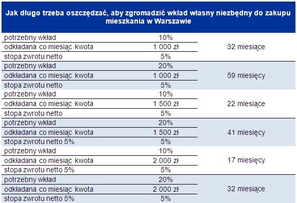 Aby zgromadzić tylko kwotę potrzebną na wkład własny osoba, która zechce kupić przeciętne mieszkanie w Warszawie w 2015 r. (bez ubezpieczenia kredytu) będzie musiała oszczędzać 59 miesięcy, czyli niemal pięć lat. Przez ten czas zgromadzi wymaganą kwotę, o ile będzie co miesiąc odkładać 1000 zł, a stopa zwrotu z oszczędności wyniesie 5%. W przypadku konieczności zgromadzenia 10-proc. wkładu własnego niezbędny czas oszczędzania, przy tych samych parametrach, wyniesie 32 miesiące, czyli ponad 2,5 roku.
