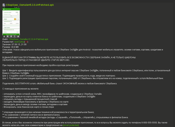Ostatnio analitycy bezpieczeństwa Doctor Web wykryli trojana bankowego Android.BankBot.65.origin wbudowanego w aplikację do bankowości online rosyjskiego banku Sberbank i dystrybuowanego z użyciem schematu opisanego powyżej. Dodając złośliwą funkcjonalność do programu, cyberprzestępcy zmodyfikowali go i osadzili nową wersję na jednej z popularnych stron przeznaczonych dla urządzeń mobilnych. Zarażona kopia aplikacji działa dokładnie tak samo jak jej oryginalna wersja, więc użytkownicy nie uważają pobranego programu za złośliwy, co zagraża bezpieczeństwu ich poufnych danych. Jak dotąd ponad 70 właścicieli urządzeń z Androidem pobrało już tę zmodyfikowaną aplikację.