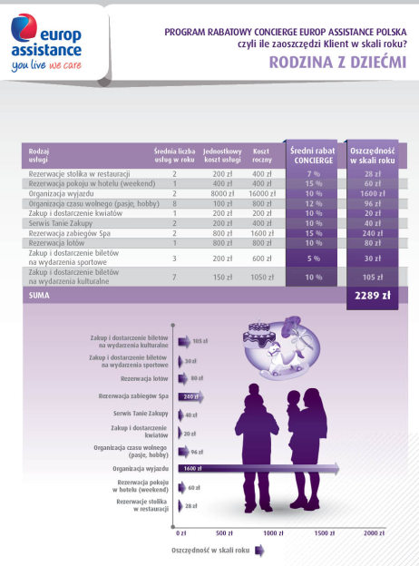 W symulacji przyjęto założenie, że klient – mieszkaniec dużego miasta, posiadający rodzinę korzysta z serwisu concierge w celu dokonania rezerwacji w restauracji (2 razy rocznie), rezerwacji w hotelu (1 raz w roku), organizacji wakacji (2 razy rocznie), zakupu i dostawy kwiatów (1 raz w roku), rezerwacji biletów na wydarzenia kulturalne i sportowe (10 razy rocznie), rezerwacji biletów lotniczych (1 raz w roku), rezerwacji zabiegów SPA/kosmetycznych (2 razy rocznie) oraz rezerwacji lub pomocy w organizacji świadczeń z kategorii pasje/hobby (8 razy rocznie). Średni, roczny koszt realizacji powyższych świadczeń to 22 150 zł. Do tego kosztu należy doliczyć czas spędzony na wyszukiwaniu ofert i samodzielnej realizacji. Program rabatowy Europ Assistance Concierge pozwala klientowi zaoszczędzić rocznie 2 289 zł, przy jednoczesnym przejęciu ciężaru organizacji i wyszukiwania propozycji, a niejednokrotnie i dostarczeniu zamówionych produktów we wskazane miejsce.