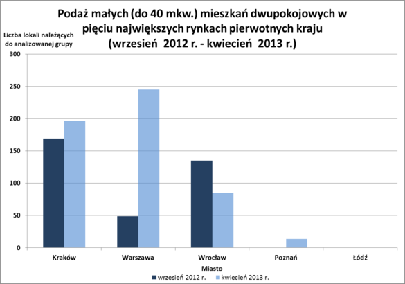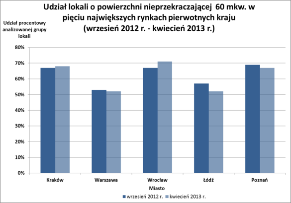 Podaż i udział niewielkich lokali (do 60 mkw.) w pięciu największych rynkach pierwotnych kraju (wrzesień 2012 r. – kwiecień 2013 r.)