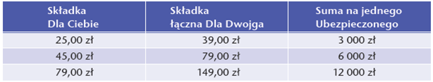 * W wariancie Dla dwojga suma ubezpieczenia przypada na każdą ubezpieczoną osobę, łącznie suma ubezpieczenia to 6000 zł, 12.000 zł lub 24.000 zł. Wariant Dla Dwojga skierowany jest do małżeństw oraz partnerów i osób bliskich, które mieszkają razem i wspólnie prowadzą gospodarstwo domowe.