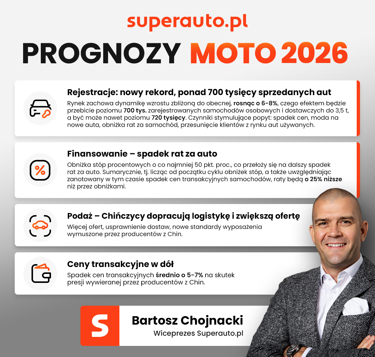 Rok 2026 przyniesie dalszy wzrost sprzedaży nowych samochodów w Polsce i nowe rekordy. Liczba zarejestrowanych pojazdów może osiągnąć poziom nawet 720 tysięcy – przewiduje Bartosz Chojnacki, wiceprezes Superauto.pl. Będzie to rok spadku cen transakcyjnych nowych aut o 5-7%, co nastąpi albo przez rewizję oficjalnych cenników do poziomu z lat 2021-2022, albo politykę ogromnych rabatów lub gratisowego doposażania samochodów.