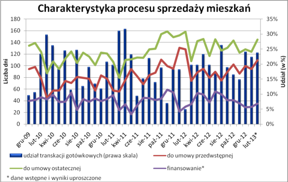 Wydłużenie całego procesu sprzedaży może martwić biorąc pod uwagę, że w lutym aż 24% zawartych transakcji odbyło się bez udziału finansowania bankowego (transakcje gotówkowe). W prawie co czwartej transakcji umowa przedwstępna nie była więc potrzebna, tak samo jak czasochłonne procedury kredytowe. Fakt ten powinien raczej wpłynąć na skrócenie całego procesu sprzedaży. Obecny udział transakcji gotówkowych jest bowiem wysoki. Średnia z ostatnich 12 miesięcy pokazuje, że umowy przedwstępnej nie zawarto w przypadku 19% transakcji na rynku wtórnym.