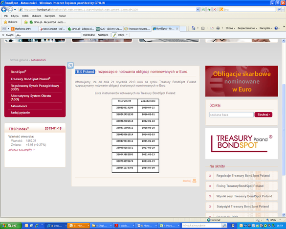 Od 21 stycznia 2013 r. na rynku TBS Poland notowanych jest 10 serii obligacji o łącznej wartości nominalnej 24,5 mld euro. Pierwszy raz na rynku elektronicznym w Polsce dostępne będą skarbowe papiery wartościowe nominowane w euro.