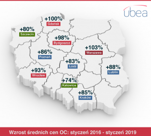 PRNews.plWiadomościUbezpieczeniaOC w metropoliach dwa razy droższe niż w 2016 r.Barometr Ubea styczeń 2019 miasta 31.01 – infografika