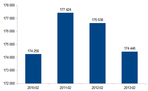 Komisja Nadzoru Bankowego opublikowała najnowsze dane z sektora bankowego. Jedną ze stałych pozycji raportu jest poziom zatrudnienia w sektorze bankowym. Na koniec lutego w bankach pracowało 174446 osób. To blisko o 3 tysiące osób mniej niż jeszcze na koniec października 2012 roku, kiedy to zatrudnienie w sektorze wynosiło rekordowe 177,4 tys. pracowników.
