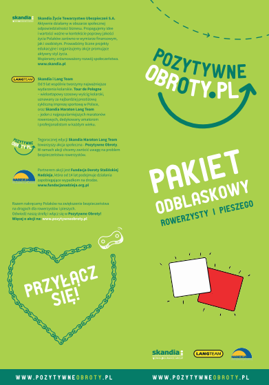Akcja społeczna Pozytywne Obroty organizowana jest po raz drugi przez Skandię i Lang Team. Jej tegoroczna odsłona koncentruje się na problemie bezpieczeństwa rowerzystów (szczególnie tych najmłodszych) na drogach, jak również na zwiększaniu świadomości bezpiecznej jazdy na rowerze, a także poruszania się pieszych na drogach. By wziąć w niej udział wystarczy wsiąść na rower i przejechać jedną z czterech tras na Skandia Maraton Lang Team lub w specjalnej strefie kibica na trenażerach. Każdy kilometr nakręcony w ramach akcji to pakiet bezpieczeństwa (szkolenie + odblaski) dla młodych rowerzystów i pieszych w regionie. Ambasadorką akcji jest Dorota Stalińska. Więcej o akcji: www.pozytywneobroty.pl