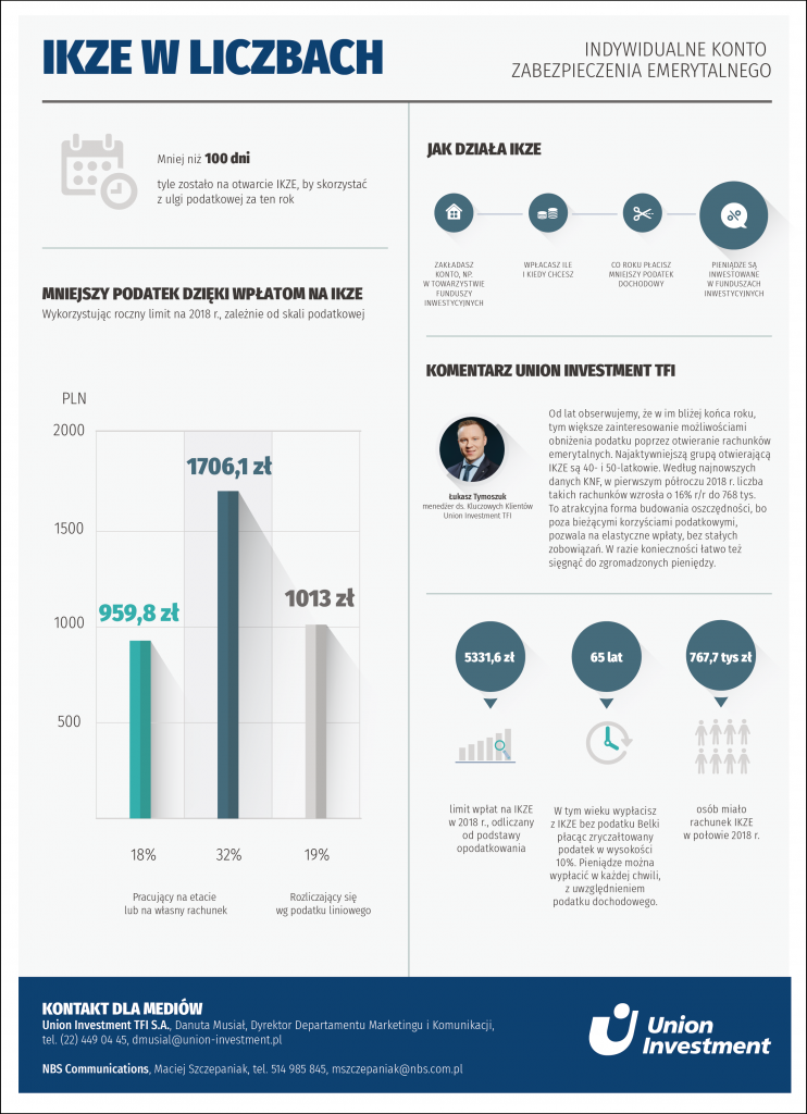 – Wykorzystując cały limit i wpłacając w pozostałym do końca roku czasie pełną kwotę, czyli 5331,60 zł , możemy obniżyć podatek dochodowy o ok. 1000 zł jeśli płacimy podatek PIT wg stawki 18% lub nawet o 1706 zł, w przypadku drugiego progu podatkowego. – mówi Łukasz Tymoszuk, menadżer ds. kluczowych klientów Union Investment TFI. Z odliczenia mogą także skorzystać przedsiębiorcy, którzy płacą 19-procentowy podatek liniowy. W ich przypadku, w kieszeni pozostanie ponad 1000 zł.