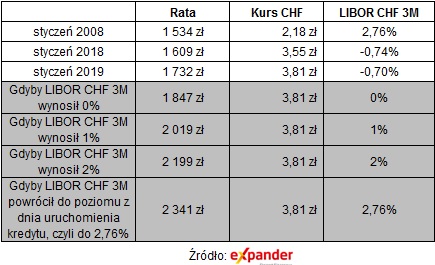 Bardzo trudno jest przewidzieć co będzie działo się z kursem franka w przyszłości. Prawdopodobne jest natomiast, że oprocentowanie będzie rosło. Gdyby LIBOR CHF 3M przestał być ujemny, a więc wyniósł zero, a kurs pozostał na obecnym poziomie, to rata wzrosłaby o kolejne 115 zł (do 1 847 zł). Gdyby stawka LIBOR powróciła do poziomu z stycznia 2008 r., to przy obecnym kursie franka, rata wyniosłaby aż 2 340 zł. Byłaby więc aż o 608 zł wyższa niż obecnie.