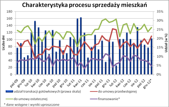 Statystycznie rzecz biorąc, aby w grudniu zakończyć formalności związane ze sprzedażą mieszkania, trzeba było wystawić ofertę w sierpniu. Jest to znacznie lepszy wynik niż notowany na przełomie 2011 i 2012 roku, kiedy cały proces sprzedaży nierzadko zajmował ponad 150 dni. Należy jednak zauważyć, że w ostatnich miesiącach długość procesu sprzedaży charakteryzuje duża zmienność. Ostatni wyraźny trend wydłużania się tego procesu widoczny był w okresie od marca 2011 do marca 2012 roku. Od tego momentu mamy raczej do czynienia ze stabilizacją długości procesu sprzedaży.