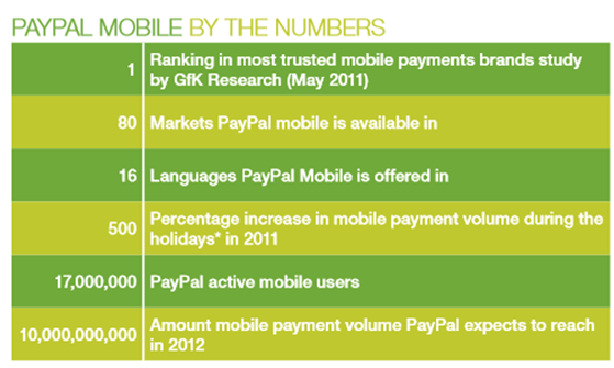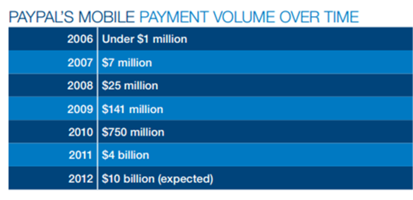 Ilość mobilnych płatności w systemie PayPal na przestrzeni lat rosła lawinowo z 1mln USD w 2006 roku i 750 mln USD w 2010 do aż 4 miliardów USD w 2011. Szacuje się, że w 2012 mobilne płatności za pośrednictwem PayPal sięgną 10 miliardów USD.