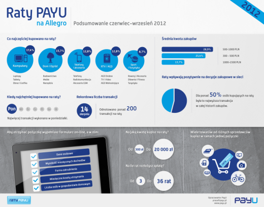 Od czerwca użytkownicy Allegro mogą kupować na raty bez papierowych zaświadczeń. Raty w nowej  odsłonie, dostarczane przez PayU, zachęciły do zrobienia zakupów już ponad 10 tys. użytkowników, którzy najczęściej finansowali w ten sposób zakup telefonów komórkowych, laptopów, tabletów, mebli i drobnego AGD. Czas na pierwsze kwartalne podsumowanie.