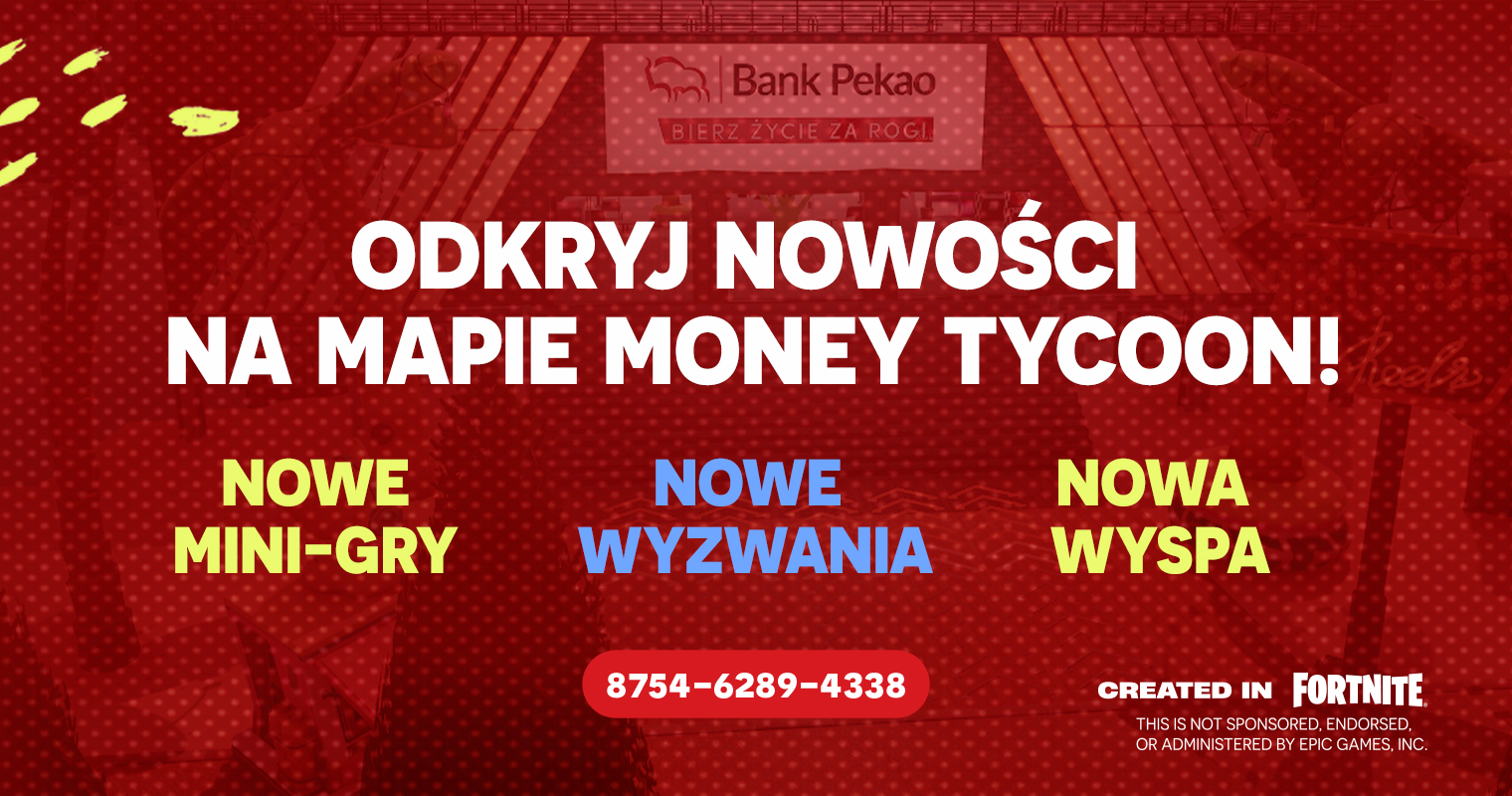 Bank Pekao S.A., który w grudniu ubiegłego roku udostępnił graczom mapę Money Tycoon w grze Fortnite jako pierwszy bank w Polsce, wprowadza obecnie do niej wiele nowości. Dostarczą one odbiorcom jeszcze więcej radości z gry i nowych treści edukacyjnych. Mapa Money Tycoon dostępna jest za darmo na wszystkich urządzeniach (na komputerze, w mobilu czy na konsoli) pod linkiem: https://www.fortnite.com i z kodem do gry: 8754-6289-4338.