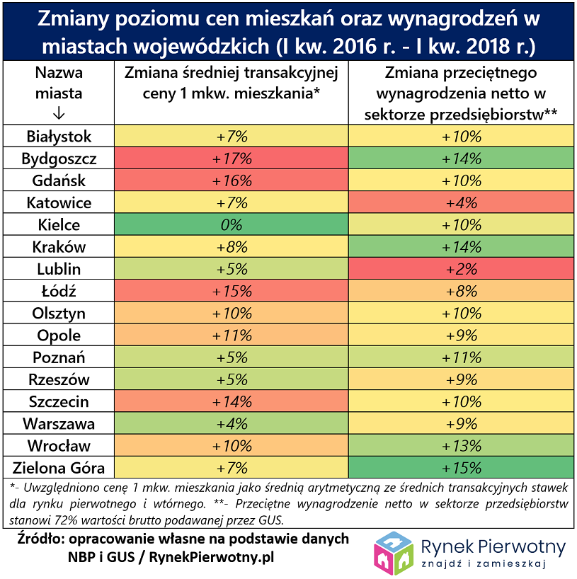 Rekordowo niska stopa bezrobocia wymusiła wzrost nominalnych wynagrodzeń. Taką zmianę odczuwa coraz większa liczba Polaków. Sytuacja wygląda mniej optymistycznie, jeżeli porównamy tempo podwyżek dotyczących cen mieszkań oraz płac Polaków. Analiza portalu RynekPierwotny.pl wskazuje, że w niektórych miastach wojewódzkich wzrosty wynagrodzeń nie kompensują coraz wyższych kosztów zakupu lokali. Warto sprawdzić, gdzie przez ostatnie dwa lata sytuacja przedstawiała się nieco lepiej.