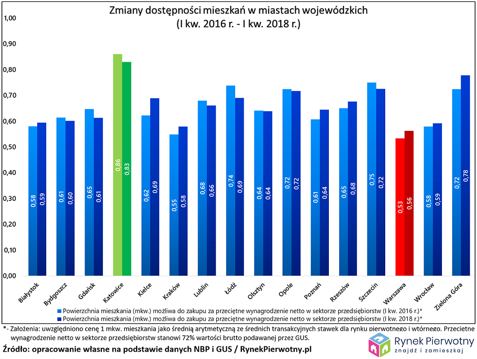 Analiza wykonana przez ekspertów portalu RynekPierwotny.pl uwzględnia dostępność mieszkań z miast wojewódzkich w I kw. 2016 r. oraz I kw. 2018 r. Przyjęcie początku 2016 r. jako punktu wyjściowego wydaje się zasadne, bo w tym czasie były już widoczne symptomy dobrej koniunktury na rynku mieszkaniowym. Natomiast uwzględnienie I kw. 2018 r. jest wymuszone brakiem nowszych informacji o poziomie wynagrodzeń. Dane dotyczące płac niestety są najbardziej problematyczną kwestią podczas badania poziomu dostępności mieszkań. Główny Urząd Statystyczny rzadko podaje bowiem medianę wynagrodzeń. Co gorsza, takie medianowe wyniki dotyczą jedynie całej Polski. W przypadku miast wojewódzkich, można sprawdzić tylko zmiany przeciętnego miesięcznego wynagrodzenia brutto z sektora przedsiębiorstw. Analitycy RynekPierwotny.pl uwzględnili takie przeciętne stawki w ujęciu netto (pomniejszone o 28% w związku z podatkiem dochodowym, składkami społecznymi oraz składką zdrowotną). Przeciętne wynagrodzenie netto (w sektorze przedsiębiorstw) porównano z uśrednioną transakcyjną ceną 1 mkw. nowych i używanych lokali. Wyniki opisywanego porównania dotyczące I kw. 2016 r. oraz I kw. 2018 r. mówią nam o tym, ile metrów kwadratowych mieszkania można było kupić za przeciętną pensję.