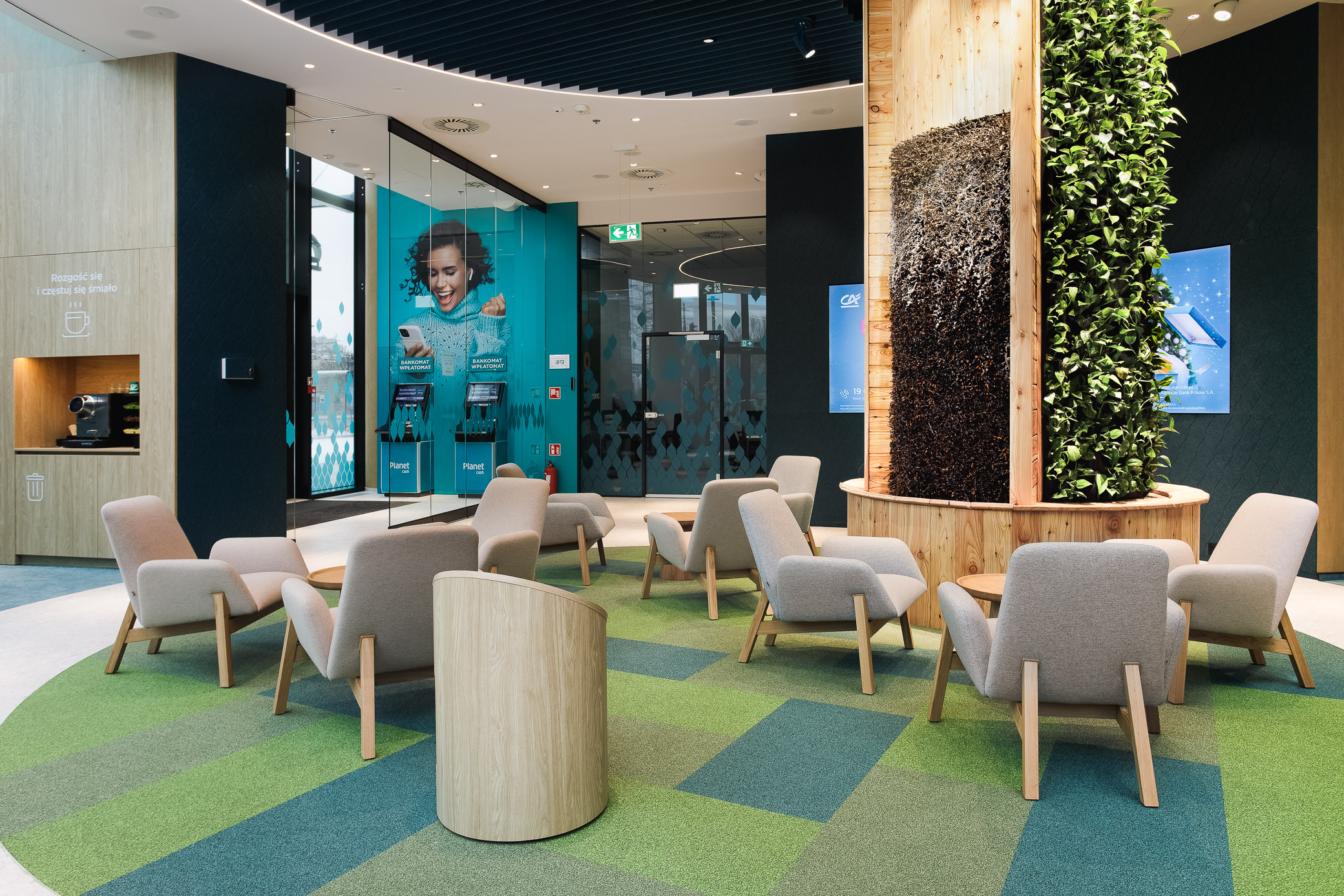 Centralna strefa placówki nazywana jest „epicentrum”. Nie tylko dlatego, że znajduje się w środku lokalu, ale również symbolizuje pełne skupienie na potrzebach klienta. – Chcemy, żeby klient czuł tę spójność: wyjątkowe wnętrze i wyjątkową kulturę obsługi w wyjątkowym banku – podkreśla Beata Borucka, managerka projektów marketingowych.