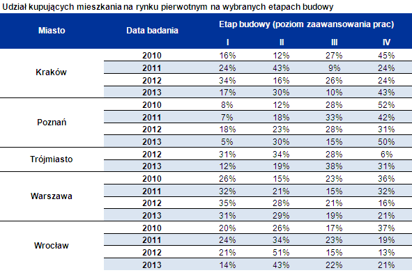Trzeba także zauważyć, że odsetek kupujących mieszkania na poszczególnych etapach budowy kształtuje się różnie, w zależności od miasta. Największy udział sprzedaży na wstępnym etapie budowy jest notowana w Warszawie (31%), a najmniejsza w Poznaniu (5%). Z drugiej strony kupujący preferują lokale oddane do użytkowania w Krakowie i Poznaniu. Stanowiły one odpowiednio 43% i 50% sprzedanych w ostatnich 3 miesiącach mieszkań deweloperskich. Dla porównania w Warszawie i Wrocławiu było to po 21% transakcji.