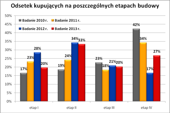 W ostatnich 3 miesiącach co piąty nabywca zdecydował się na zakup mieszkania w inwestycji, która była na etapie co najwyżej zerowym, czyli przed wyjściem budowy nad ziemię. Względem pierwszego badania (2010 r.) oznacza to wzrost o 3 pkt. proc., a z drugiej strony spadek o 8 pkt. proc. względem odczytu sprzed roku. Do niewielkich przetasowań względem 2012 roku doszło w przypadku inwestycji, które przekroczyły już stan zerowy, a nie dotarły jeszcze do decyzji o oddaniu do użytkowania. Tu znajduje się etap o największej popularności wśród nabywców. Co trzeci nabywca kupił od dewelopera mieszkanie w czasie gdy budowa wyszła już nad poziom ziemi, ale budynek nie miał jeszcze położonej elewacji. W tegorocznym badaniu na popularności zyskały natomiast lokale oddane do użytkowania. Teraz mają one udział w rynku na poziomie 27%, a przed rokiem było to o ponad jedną trzecią mniej, czyli 17%.Decydując się na lokal już gotowy zazwyczaj można wybierać z ograniczonej puli pozostałych do sprzedania mieszkań. Zwykle są to lokale o większym metrażu i cenie. Z drugiej jednak strony, gdy deweloperowi zależy na zamknięciu danego projektu i chce uniknąć kosztów utrzymania niesprzedanych nieruchomości, może zaoferować atrakcyjne rabaty.