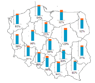 Na mapce przedstawiono średnie wynagrodzenia zasadnicze w sektorze bankowości menedżerów sieci sprzedaży w odniesieniu do wyników ogólnopolskich (100%). Pozwala to na zidentyfikowanie jak opłacani są przedstawiciele tych stanowisk w zależności od miejsca pracy.