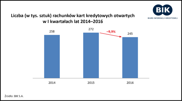 Liczba nowych umów na karty kredytowe spadła r./r. w I kwartale o 10%, w marcu odnotowaliśmy spadek o 16%. Podobnie jak na rynku kredytów konsumpcyjnych, banki koncentrują się na umowach z wyższymi limitami kredytowymi. Licząc sumę przyznanych limitów, nowych umów było o 2,6% mniej niż w I kwartale 2015 r. Na koniec marca 2016 r. w portfelach mieliśmy 6041 tys. kart kredytowych, czyli o 10 tys. mniej niż w grudniu, i o 140 tys. mniej niż w marcu 2015 r.