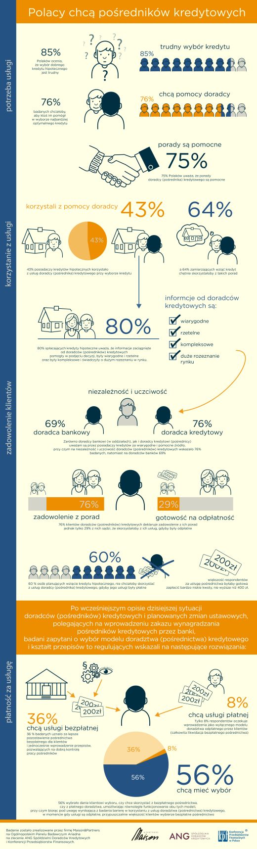 Według badań, wybór kredytu hipotecznego jest trudny dla 85% Polaków, a 3/4 badanych chciałoby, żeby ktoś im w tym pomógł. Większość Polaków dobrze  ocenia porady doradców bankowych oraz pośredników kredytowych, jednak ci drudzy lepiej wypadają w ocenie uczciwości i niezależności. Aż 92% Polaków nie chce zmian w przepisach o pośrednictwie kredytowym w proponowanym przez rząd kształcie.