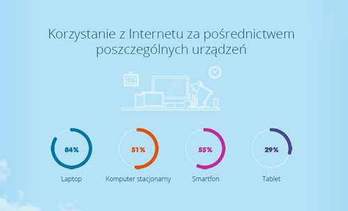 Niemal wszyscy, bo aż 99% badanych korzysta z Internetu za pośrednictwem komputera, przy czym częściej, bo w 84% przypadków, jest to laptop, a dopiero później komputer stacjonarny (51%). Co druga badana osoba sięga po smartfona, który stał się równie popularny jak komputer stacjonarny. Najmniejszą popularnością cieszą się tablety, jednak ich pozycja nie jest zagrożona, korzysta z nich niemal 1/3 ankietowanych.
