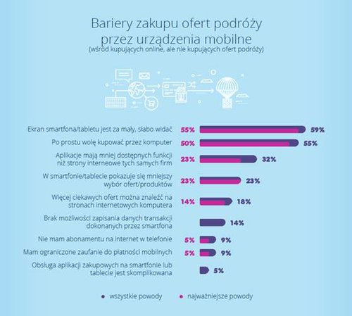 Mniejsza popularność zakupu ofert podróży przez urządzenia mobilne nie jest przypadkowa. Istotną przeszkodą w tym sposobie realizacji swoich wakacyjnych planów jest zbyt mały ekran, który utrudnia dokładne zapoznanie się z ofertą oraz szybkie i sprawne dokonanie zakupu. Inne przyczyny to ograniczona liczba funkcji dostępnych w takich aplikacjach, mniejszy wybór ofert, a także brak zainstalowanej aplikacji banku, przez którą mogłyby być dokonane płatności. Część badanych obawia się o bezpieczeństwo transakcji przeprowadzanych na smartfonie czy tablecie.