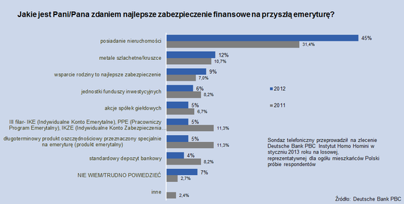Według wyliczeń za miniony rok, ceny transakcyjne mieszkań w Polsce zmniejszyły się w 2012 r. średnio o kilkanaście procent. Był to najgwałtowniejszy spadek w ostatnich latach. Mimo to właśnie nieruchomości drugi rok z rzędu są wskazywane jako zdecydowanie najlepsza inwestycja długoterminowa – wynika z badań Deutsche Bank PBC przeprowadzonych w styczniu przez Instytut Homo Homini. Aż 45 procent respondentów wskazało „posiadanie nieruchomości” jako najlepsze zabezpieczenie finansowe na emeryturę. To aż o 50 proc. więcej wskazań na to aktywo niż przed rokiem.