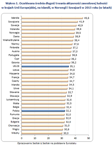 Okazuje się, że Polacy w porównaniu do mieszkańców Unii Europejskiej pracują w ciągu swojego życia stosunkowo krótko. Zgodnie z danymi z 2013 roku było to przeciętnie 32,2 lata. Dla porównania, średnia dla Unii Europejskiej wyniosła 35,1 lat. Wartość oczekiwanej długości trwania aktywności zawodowej jest zdecydowanie najwyższa dla Islandczyków i Szwajcarów, czyli dla mieszkańców państw, które nie są członkami Unii. W krajach tych wskaźnik wynosił w 2013 roku odpowiednio aż 45,6 i 41,9 lat.